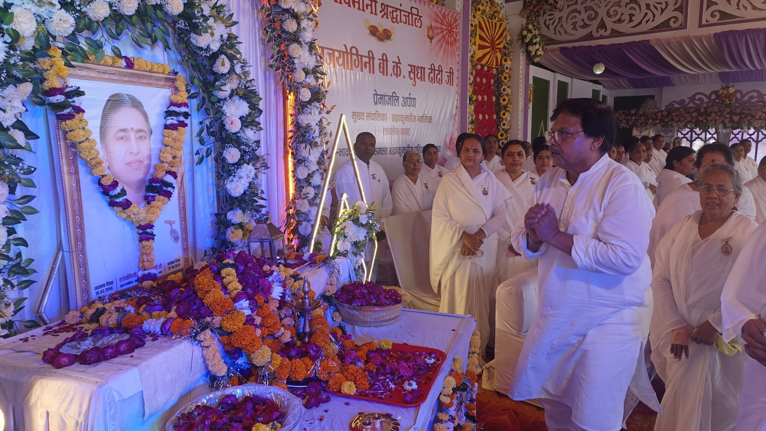 ग्वालियर, 5 नवम्बर2025।। प्रजापिता ब्रह्माकुमारी ईश्वरीय विश्व विद्यालय ग्वालियर तानसेन नगर केंद्र की संचालिका राजयोगिनी ब्रह्माकुमारी सुधा दीदी को प्रदेश के उर्जा मंत्री प्रदुमन सिंह तोमर सहित प्रदेश भर से पधारे सैकड़ों लोंगो ने उन्हें श्रद्धांजलि दी।
